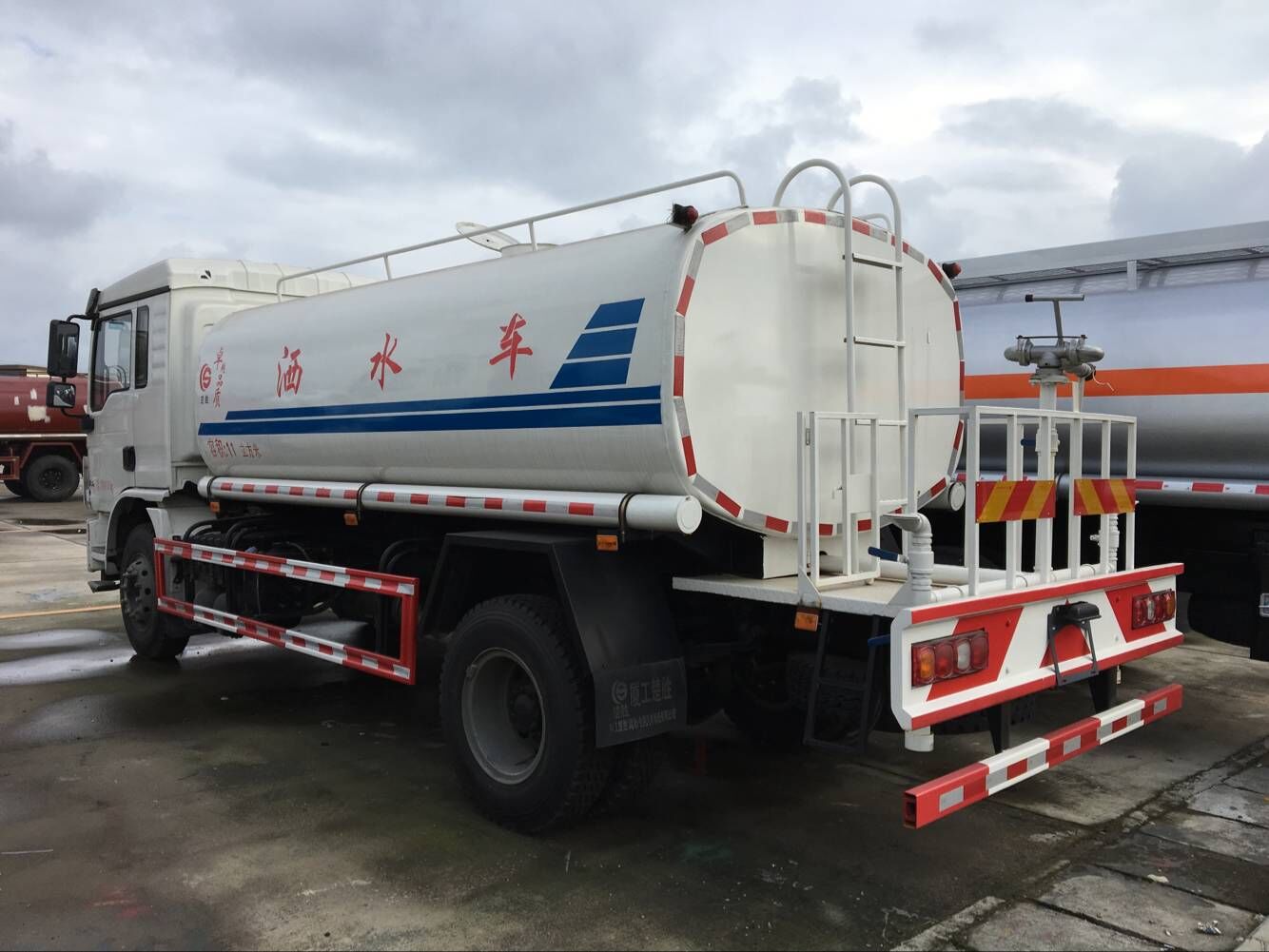 采用國標(biāo)武鋼碳鋼板材制作,罐體實(shí)際容積12立方,前沖(噴)、后灑、帶側(cè)噴(花灑),帶后工作平臺(tái),平臺(tái)上安裝鋼制芯專用大功率綠化灑水高炮(炮有直流狀、大雨、毛毛雨、霧狀可調(diào)節(jié),可噴灑農(nóng)藥),配備大功率專用灑水泵,帶消防接頭,帶自流閥,帶自吸功能。同時(shí)可以用于臨時(shí)應(yīng)急消防灑水,每輛灑水車都配備消防專用接口。由發(fā)動(dòng)機(jī)帶動(dòng)變速箱,變速箱上安裝的取力器帶動(dòng)灑水泵,灑水泵產(chǎn)生主要?jiǎng)恿Γ瑢⒐摅w內(nèi)部的液體通過管網(wǎng)噴灑出去。自吸高度:≤7m,灑水寬度:≥20m,最大射程:≥28m;可調(diào)節(jié)成柱狀,射程≥28m;也可調(diào)節(jié)成霧狀,射程≥15m。前噴后灑,前裝有鴨形噴嘴或圓頭沖嘴,后面裝有圓柱開灑水噴嘴或蓮蓬頭噴嘴,后部有一工作平臺(tái),裝配有高壓水炮。后部還可裝8個(gè)噴嘴(選裝)噴水器一般用于沖洗街道。可選配藥盤、打藥機(jī)。也可加裝藥盤、藥泵、罐內(nèi)防腐防銹、多方位進(jìn)出水接頭、電磁閥、氣動(dòng)閥等先進(jìn)設(shè)施,以滿足不同用戶需求。