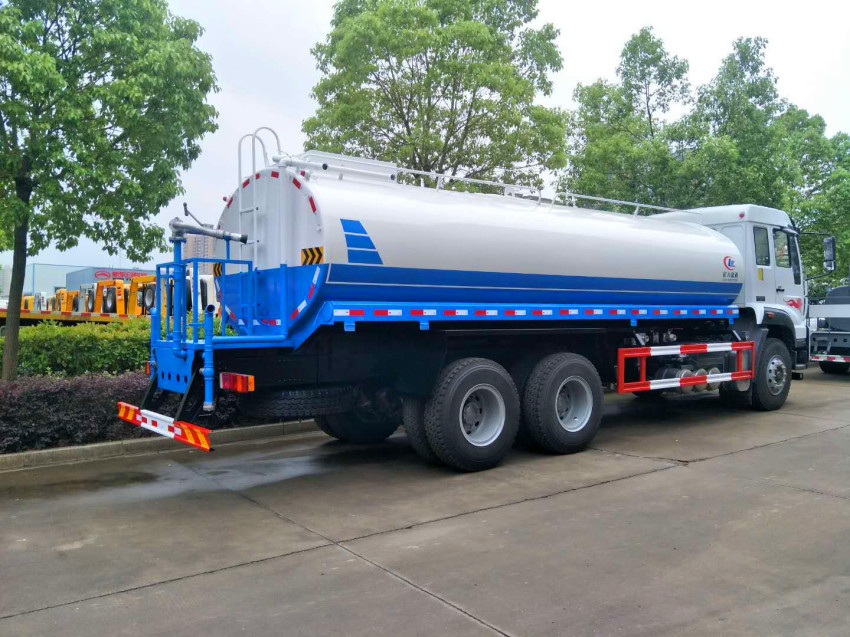 有免征公告,可以免購置稅,嚴格按照公告尺寸生產,罐體實際容積20方,罐體采用國標武鋼碳鋼板材制作,帶泵,可泵進泵出,帶前沖、后灑、側噴,后工作平臺帶綠化高射炮。平臺上安裝鋼制芯專用大功率綠化灑水高炮(炮有直流狀、大雨、毛毛雨、霧狀可調節,可噴灑農藥),配備大功率專用灑水泵,帶消防接頭,帶自流閥,帶自吸功能。同時可以用于臨時應急消防灑水,每輛灑水車都配備消防專用接口。由發動機帶動變速箱,變速箱上安裝的取力器帶動灑水泵,灑水泵產生主要動力,將罐體內部的液體通過管網噴灑出去。自吸高度:≤7m,灑水寬度:≥20m,最大射程:≥28m;可調節成柱狀,射程≥28m;也可調節成霧狀,射程≥15m。前噴后灑,前裝有鴨形噴嘴或圓頭沖嘴,后面裝有圓柱開灑水噴嘴或蓮蓬頭噴嘴,后部有一工作平臺,裝配有高壓水炮。后部還可裝8個噴嘴(選裝)噴水器一般用于沖洗街道。可選配藥盤、打藥機。也可加裝藥盤、藥泵、罐內防腐防銹、多方位進出水接頭、電磁閥、氣動閥等先進設施,以滿足不同用戶需求。