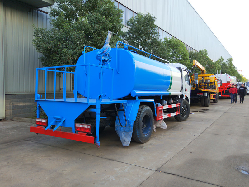 罐體用4MM碳鋼板制作,罐內隔板具有防波作用,以減低汽車行駛時罐體液體的沖擊。整車帶一個專用灑水泵(垂直吸程6米),灑水寬度14米,射程28米。多功能灑水車配備2個前沖(噴)(能將路面泥巴、塵土、垃圾沖干凈);2個后灑(能均勻地將水灑在路面,一次灑水寬度14米)、2個側噴(花灑)(能均勻地將路旁綠化帶澆灌)、帶1個后工作平臺,平臺上安裝1個綠化灑水高炮(灑水炮可全方位旋轉,可連續調成直沖狀、大雨、小雨、毛毛雨,霧狀可調節沖洗高大樹木),引水時間<5min,流量90m3/h。帶1個消防接頭,帶1個自流閥,1個過濾裝置、人性化爬梯及側防護欄,安裝灑水音樂喇叭。