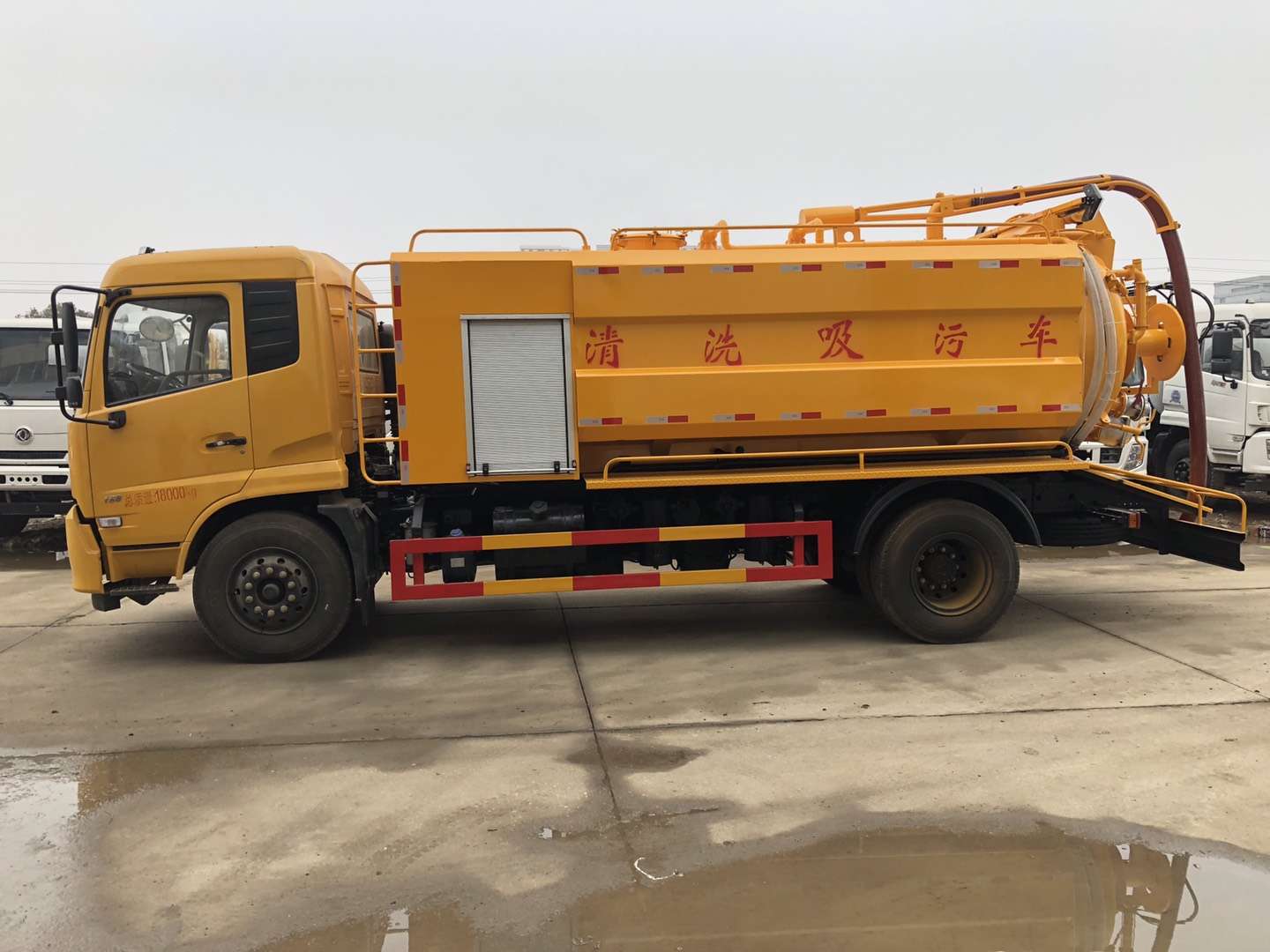 罐體容積9立方,采用武鋼優質鋼板制作(6個厚)采用意大利中冷型真空泵,罐體上部帶液壓吸污吊桿(可360度旋轉,遙控控制)配備一根10米吸污管,尾部一個150排污球閥,帶一個100的自流口,水箱容積4立方,配備德國品孚215L高壓泵,22兆帕,帶60米19號高壓管,帶10個組合噴頭,罐體可以液壓舉升,后大蓋可開啟,帶4個鎖緊裝置,帶箭頭燈,LED夜間作業燈,其他標配。