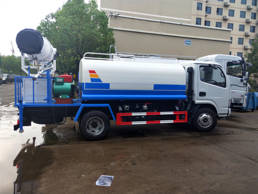 小型水炮車-4立方多功能抑塵車性能簡介: 垂直吸程7米,灑水寬度14-16米,射程28-30米,揚程90米,引水時間8MIN,流量60M3/H。灑水炮可全方位360度旋轉,可連續調成柱狀、霧狀、大雨、小雨、毛毛雨,綠化、消防、沖洗于一體,帶安全護欄。  基本組成:罐體,取力器,專用自吸式灑水泵,管網,噴灑出口.    可以廣泛用于市政環衛、公路工程、大型廠礦、森林綠化消防、園林綠化、高速公路、機場碼頭、公園社區、煤礦灑水降溫、降塵、綠化、沖洗公路,緊急情況下還可用于消防滅火。