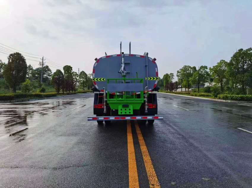 4.灑水車前噴頭位置較低,靠近地面,噴灑壓力較大,可用于沖洗路面;后噴頭位置較高(灑水車后噴頭一般左右各安裝一個),灑水面較寬,可用于公路施工灑水,使用后噴頭時,應將前噴管關閉;使用可調噴頭灑水時,灑水寬度可根據需要調整。灑水寬度越寬,中間重疊量越少,灑水密度越均勻。