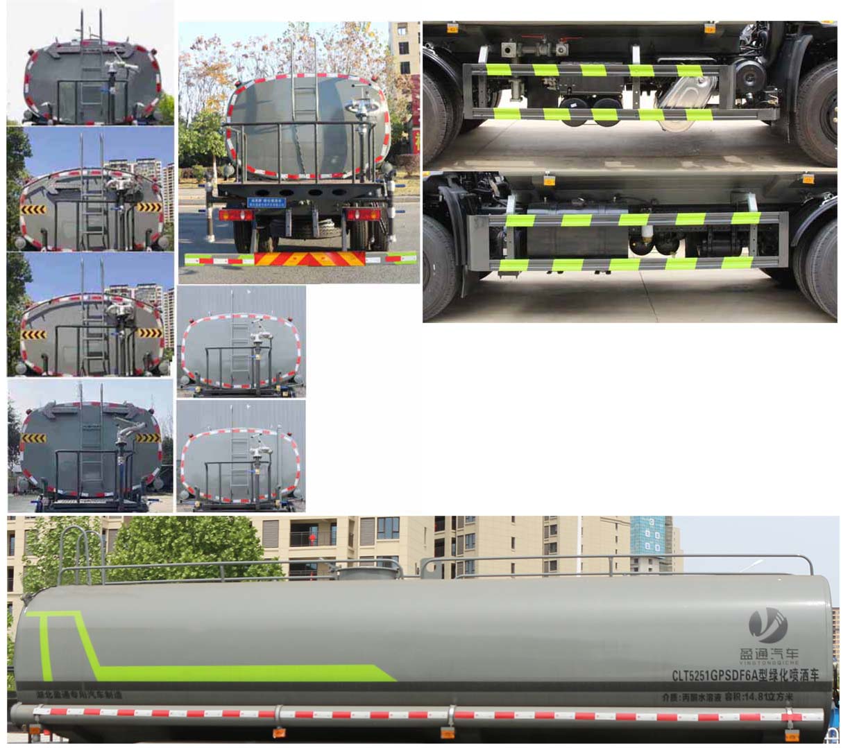 該車主要用于城鄉園林綠化噴灑,噴藥;主要裝置為罐體及噴灑裝置;隨底盤選裝駕駛室;罐體總容量:14.81立方米,罐體有效容積:14.11立方米,罐體外形尺寸(長×長軸×短軸)(mm):6800×2390×1620,6700×2400×1480;側、后防護材料均為:Q235,連接方式均為:螺栓連接,后部防護截面尺寸(mm):120×50,后部防護離地高度(mm):460;ABS型號/生產廠家:3631010-C2000/東科克諾爾商用車制動系統(十堰)有限公司,J ABS/焦作博瑞克控制技術有限公司.采用底盤4350+1350(mm)軸距。選裝擋泥板樣式。選裝后部箭頭燈,選裝后部弧形噴灑裝置,選裝后部樣式,選裝水炮支架位置,選裝自動球閥安裝位置。選裝不同外觀的后處理,選裝油箱電瓶位置,選裝罐體頂部不帶高位花灑裝置。