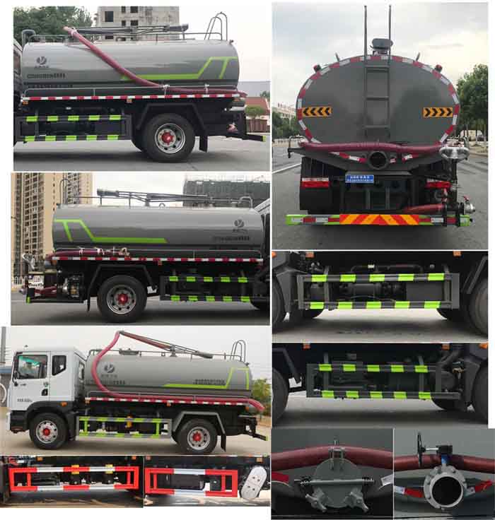 主要專用裝置:罐體及吸糞裝置,主要用于抽排運污水、糞便、泥漿等液態污物;隨底盤選裝駕駛室;罐體總容量:10.5立方米,罐體有效容積:10立方米;罐體外形尺寸(長×長軸×短軸)(mm):4400×2300×1550,5000×2300×1360;整車長度/軸距對應關系(mm):8000/4500,7200/3950; 側、后防護材料均為:Q235碳鋼,連接方式均為:螺栓連接,后部防護截面尺寸(mm):120×50,后部防護離地高度(mm):450;ABS系統生產廠家,型號:焦作博瑞克控制技術有限公司,J ABS;襄陽東風隆誠機械有限責任公司,ABS/ASR-24V-4S/4M。選裝后部出口樣式;隨底盤選裝燃油箱,電瓶,尿素罐,儲氣筒左右安裝位置.選裝罐體左右及后部樣式。選裝限速裝置,限速89。