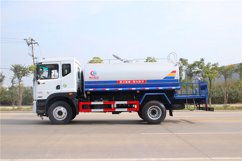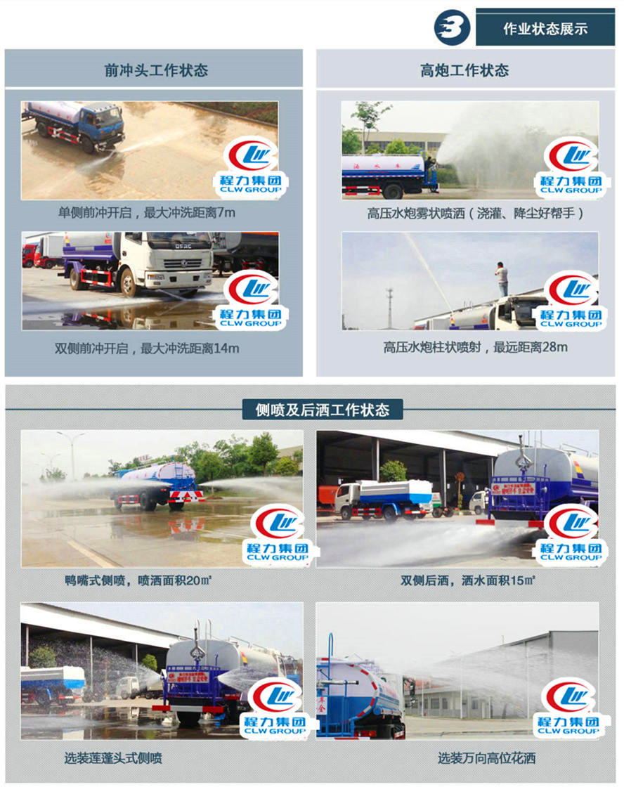 灑水車專用配置:罐體容積 13立方,罐體采用國標Q235碳鋼材質(zhì),罐體厚度4MM,前后封頭5MM加厚型,罐體內(nèi)雙層隔板具有防波蕩作用,以減輕汽車行駛時罐內(nèi)液體沖擊;灑水車整車及外形尺寸嚴格按照國家機動車公告制作而成;裝配大功率專用灑水泵,前沖、后灑、側(cè)噴、后平臺帶綠化灑水炮,灑水炮可全方位旋轉(zhuǎn),可連續(xù)調(diào)成直沖狀、大雨、小雨、毛毛雨;配消防接口,自流閥,濾網(wǎng),帶自吸自排功能。前封頭帶水位計,后平臺主管路帶1寸澆花接口,后爬梯,帶1個消防接頭,帶1個自流閥,1個過濾裝置,其余標配。1、可選裝后平臺帶霧炮機組用于噴霧降塵、農(nóng)藥噴灑作業(yè);2、可選裝前置電子灑水炮駕駛室操作;3、可選裝氣動球閥駕駛室操作。
