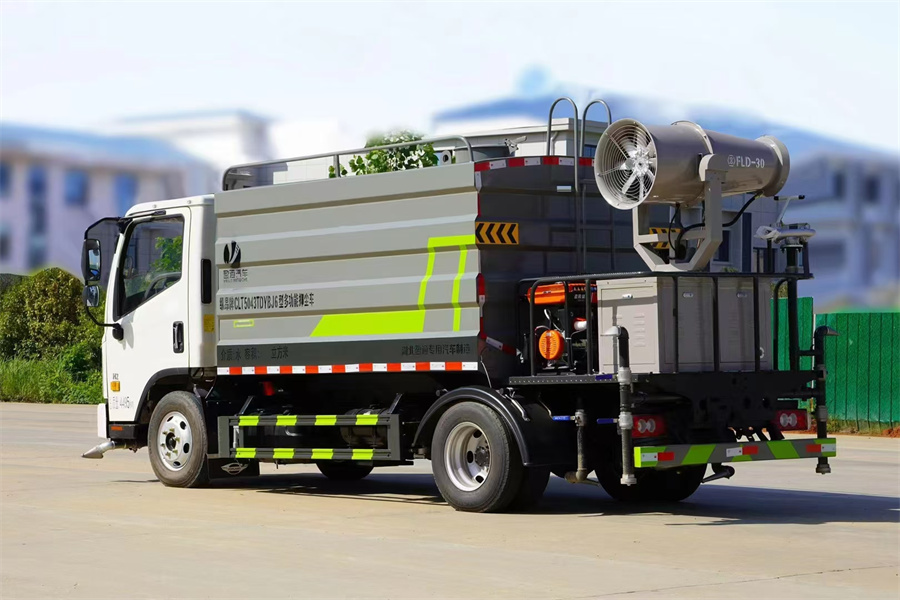 福田7方藍牌霧炮灑水車產品簡述:縱昂牌 CLT5043TDYBJ6 型多功能抑塵車標配前噴(鴨嘴)、后對 沖、后灑、側噴、后置式工作平臺,平臺上配置綠化水炮(可 360°旋轉,既可 以調成柱狀,也可以調成霧狀),配備優質大功率專用灑水泵(可自吸自排, 可從河里或池塘抽水到罐體),取力器,雜物過濾網,消防接口,自流球閥系統、 取力器、球閥、濾網均為國家標準產品,主管道加粗,法蘭墊、法蘭盤加厚, 大通徑球閥。整體具備性能優良安全可靠、效率高、流量大、維修方便等特點。