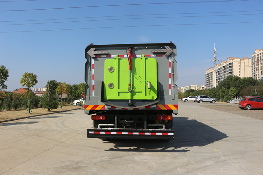 3 車輛清水箱充分利用了車載空間,容積大,容積達7m3。垃圾箱采用單層304不銹鋼結構,傾翻卸料,帶高壓位自潔裝置。自潔裝置可在垃圾箱卸料時幫助卸料,清洗垃圾箱內部。