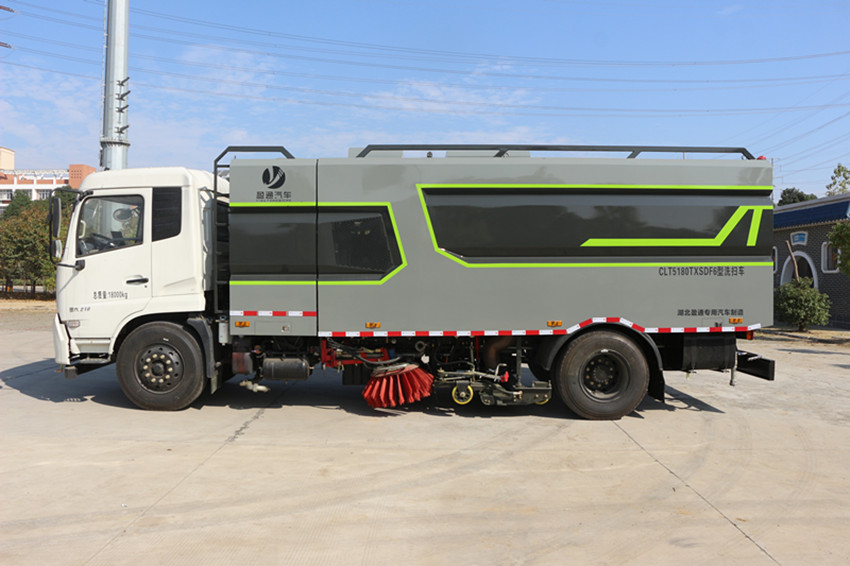 1.CLT5180TXSD6型洗掃車適用于城市道路、高速公路、廣場、機場、碼頭、遂道、橋梁、隔離墻避、路緣和路緣石立面的機械化清洗、清掃、噴霧降塵等清潔作業。具有路面清洗、路面清掃、路緣清洗、路緣和路緣石立面洗刷、低壓沖洗、噴霧除塵等多功能。有“全洗掃”、 “右洗掃”、 “全掃”、 “右掃”4種作業模式可選擇。選擇“全洗掃”模式清洗廣場和路面,清洗效率高效果好,洗凈率達90%以上。選擇“左洗掃”或“右洗掃”模式清洗路面和路緣、洗刷路緣石立面。需要進行路面清掃或路面保潔作業時,可選擇掃路模式。需要噴霧除塵時,可開啟噴霧裝置,進行噴霧除塵作業?梢韵駷⑺囈粯訉β访孢M行低壓沖洗作業。