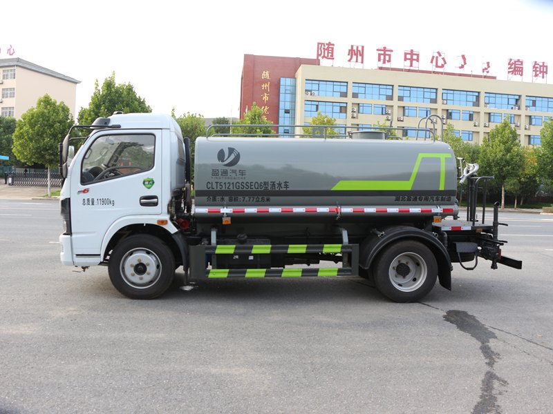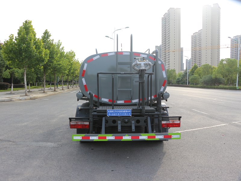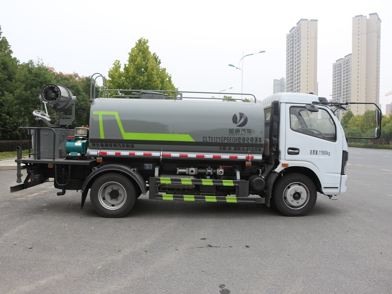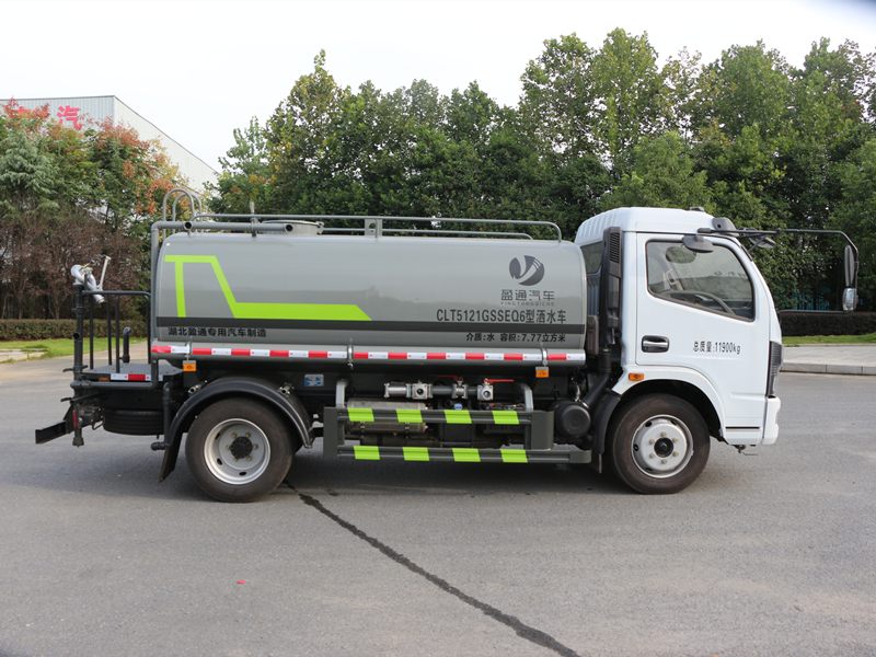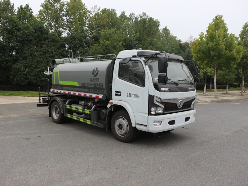 灑水車專用功能配置罐體實際容積約為8立方米,(罐體有效參數6.81立方米、額定載質量6805kg、)采用武鋼優質碳鋼板卷壓成型。配備專用灑水泵,自吸自排,前噴后灑、側噴、后工作平臺及灑水高壓炮。灑水泵自吸高度為6米左右,整車灑水寬度14米左右,后工作平臺水炮可調成:直沖狀、大雨、中雨、小雨、毛毛雨,有效射程≥28米,整車帶接頭、水位計,自流閥。后工作平臺主管路帶1寸澆花接口,附送2根3米水管,1個爬梯,兩側及后保險杠。
