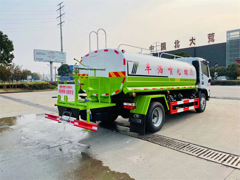整車帶一個專用灑水泵(垂直最大吸程6米),灑水寬度14米,射程28米。多功能灑水車配備2個前沖(噴)(能將路面泥巴、塵土、垃圾沖干凈);2個后灑(能均勻地將水灑在路面,一次灑水寬度14米)、2個側噴(花灑)(能均勻地將路旁綠化帶澆灌)、帶1個后工作平臺,平臺上安裝1個綠化灑水高炮(灑水炮可全方位旋轉,可連續調成直沖狀、大雨、小雨、毛毛雨,霧狀可調節沖洗高大樹木),引水時間<5min,流量90m3/h。帶1個消防接頭,帶1個自流閥,1個過濾裝置、人性化爬梯及側防護欄,安裝灑水音樂喇叭。