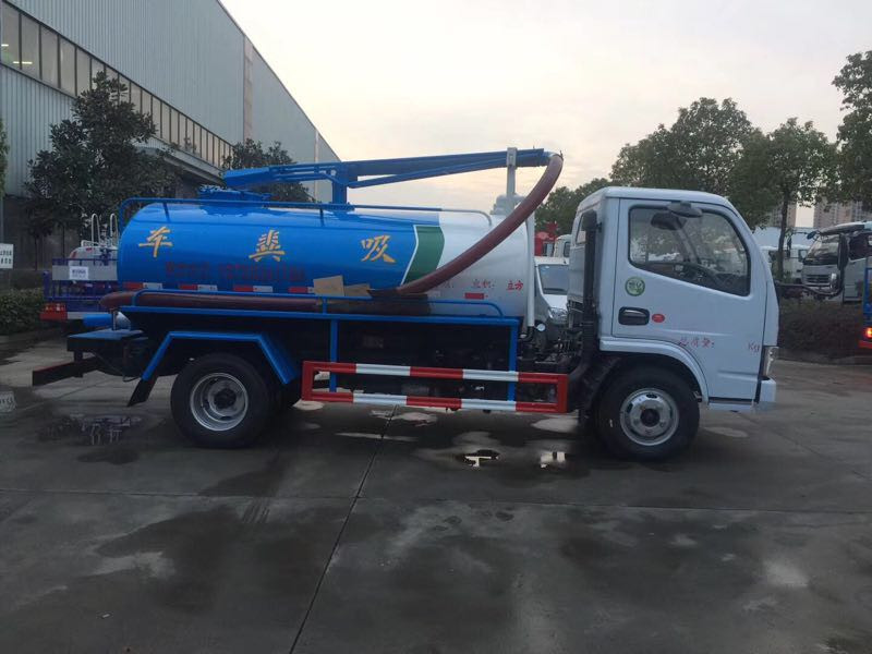 此車采用了東風福瑞卡原裝底盤,采用了朝柴95馬力發動機,馬力高、動力大。變速箱為東風5檔變速,輪胎采用700-16的輪胎,軸距為3300mm,上裝部分,按照客戶的要求,罐體容積為3立方,罐體上部的罐口由罐體尾部給位罐體中部,罐體尾部的放料口尺寸有250mm改為100mm,采用真空吸糞泵,自吸自排。