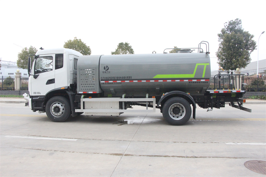 東風天錦12方電動灑水車該車主要用于城鄉園林綠化,路面噴灑;主要裝置為罐體及噴灑裝置;罐體總容量:9.77立方米;罐體有效容積9.3立方米;罐體外形尺寸(長×長軸×短軸)(mm):4000×2300×1540;側防護材料為鋁合金+Q235碳鋼,連接方式為螺栓連接;后防護材料為:Q235碳鋼,連接方式為:螺栓連接;后部防護截面尺寸(mm):120×50,后部防護離地高度(mm):480;儲能裝置種類/儲能裝置單體及總成生產企業:磷酸鐵鋰電池/寧德時代新能源科技股份有限公司/寧德時代新能源科技股份有限公司;磷酸鐵鋰電池/瑞浦蘭鈞能源股份有限公司/瑞浦蘭鈞能源股份有限公司;ABS型號/生產企業:J ABS/焦作博瑞克控制技術有限公司,選裝EBS,EBS型號及生產廠家:EBS5/東科克諾爾商用車制動系統(十堰)有限公司,該EBS包含ABS功能;驅動電機類型:永磁同步電機,電機①型號/生產企業:TZ220XY201/精進電動科技股份有限公司,額定功率100kW,峰值功率200kW;電機②型號/生產企業:TZ410XS-LKM2806/蘇州綠控傳動科技股份有限公司,額定功率128kW,峰值功率260kW;選裝前部電子水炮樣式;選裝前部不帶電子水炮,該狀態下車長為8540mm,8110mm;當前部安裝電子水炮時,車長為9040mm,8610mm,車輛前伸500mm;選裝噴灑裝置樣式。