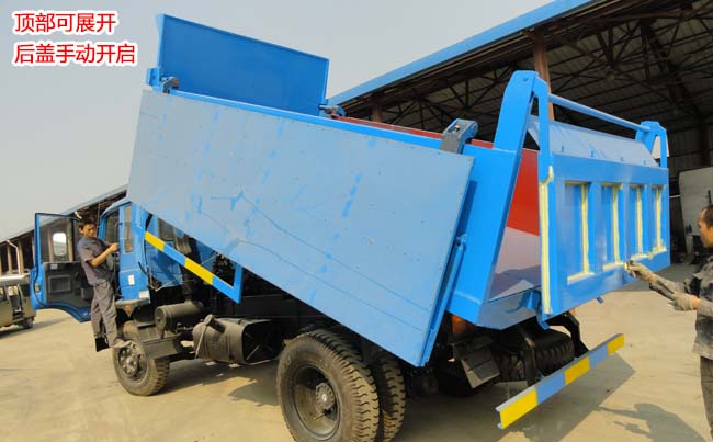 載重量10噸,外形尺寸長4.2米,寬2.3米,高0.8米,采用4毫米厚鋼板制作,箱頂可展開,可向兩邊展開折疊,箱底雙缸液壓自卸,手動開啟尾門。